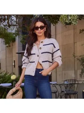 Chunky cream knit cardigan with navy horizontal stripes in great condition. Features a ribbed crew neck, button-front closure, and a relaxed fit. Soft, cozy fabric ideal for layering on cooler days. Measurements are approximate and were taken lying flat. Pit to pit 19 inches, length 23 inches. Smoke and pet free home.