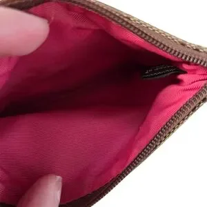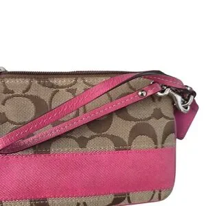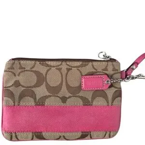 Stylish Coach wristlet in pink and brown. Perfect for carrying essentials with ease and elegance.