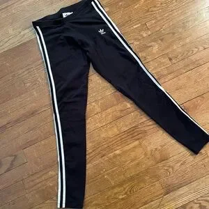 Used good condition Adidas black leggings with white stripes great for casual wear or the gym