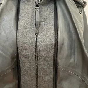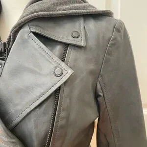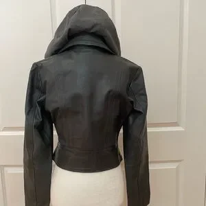 This stylish moto jacket is crafted from genuine leather and features a detachable hood, giving you versatility and edge in one sleek design.