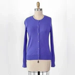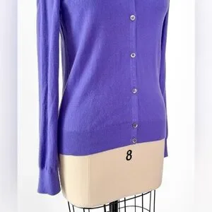 DETAILS: gorgeous medium weight 100% cashmere cardigan from luxury brand TSE in a beautiful iris purple color! Classic crewneck style and buttons down the front.