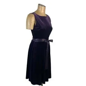 This VTG CDC elegant stretch velvet sleeveless dress in size M is perfect for special events like weddings, parties, and formal occasions. The dress features a solid purple color with a classic round/boat neckline and a V-back accent. Made from polyester spandex fabric, this vintage-inspired dress falls just below the knee or knee-length and comes with a ribbon sash at the waist for added style. With a pullover closure and lightweight stretch material, this dress offers both comfort and sophistication for any season.