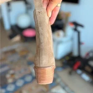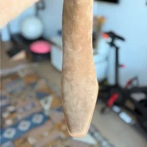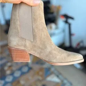 rag & bone boots in soft tan camel suede. Elastic side panels for easy wear. Stacked wooden heel and rubber outsole. Minimal, versatile silhouette for everyday style. Never worn. Brand new in the box!