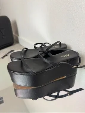 Sleek black platform sandals from Zara. Features thin strappy design for a minimalist look. Cushioned platform sole adds height and comfort. Adjustable ankle strap ensures a secure fit. Versatile black color pairs with many outfits.