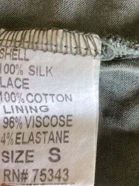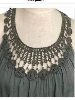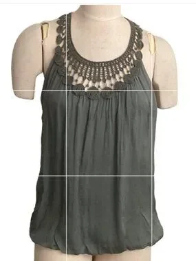Description: 100% Silk Lined Crochet Neckline Sleeveless Tank Top Blouse, Bubble elasticized hem, and Keyhole Back with Mother-of-Pearl button Closure. This is a gorgeous, classy silk blouse by Italian designer, Carla Conti. The color is sage green and there is a light liner under the silk. Its a beautiful blouse that has a flowy, airy effect. Would pair nicely with silk pants or skinny jeans and heels.