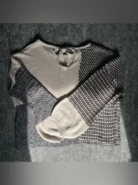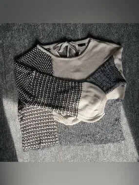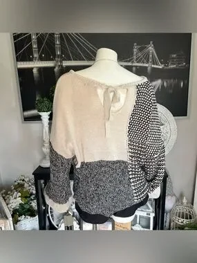 Gorgeous Blu Pepper colorblock patchwork sweater featuring mixed knit textures in cream, gray, and black. Soft, cozy, and beautifully detailed with a tie‑back keyhole at the neckline. A perfect neutral sweater for fall and winter, with tons of visual interest and a comfy relaxed fit.