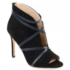 The Journee Collection Peep Toe Stiletto Heel Sandals Booties are a stylish and versatile choice for any occasion. With a high stiletto heel and criss-cross straps, these sandals are perfect for a party, wedding, or even a night out on the town. The solid color and strappy design make them a chic addition to any ensemble, while the zip closure ensures a comfortable fit. Made from faux microsuede, these sandals are perfect for the summer, fall, or spring seasons, adding a touch of sophistication to your wardrobe.