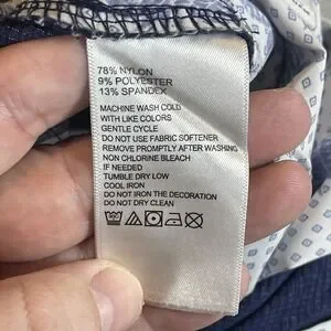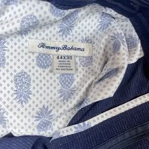 These Tommy Bahama men's pants in size 44x30 are a stylish addition to any wardrobe. The blue color and chino style make them versatile for both casual and travel occasions. Made from a blend of polyester, spandex, and nylon, these pants feature a comfortable stretch fit and a classic 5-pocket design. The flat front and straight leg give them a clean and timeless look, perfect for wearing in the summer, fall, or spring. Easy to care for with machine washable instructions, these pants from Tommy Bahama offer both style and functionality.