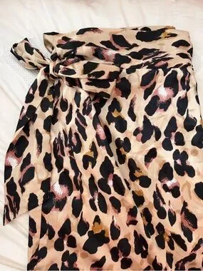 Chic tie-waist skirt with a satin finish and bold leopard print. Features a flattering high waist and decorative side bow for a polished look. Soft beige base with black and brown accents adds versatile style. Easy to dress up or down for day or evening wear.