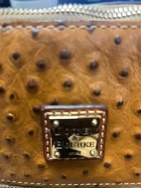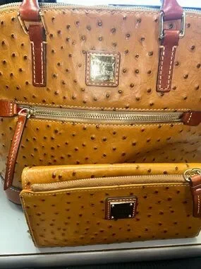 Dooney & Bourke tote with matching zip wallet in tan ostrich-embossed leather. Gold-tone hardware and exterior zip pocket on the tote. Contrast darker brown handles and trim. Textured ostrich pattern for added interest.