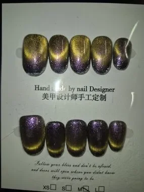 Handmade Cat Eye Magnetic Galaxy Purple And Gold Press On, Reusable Nails🌌