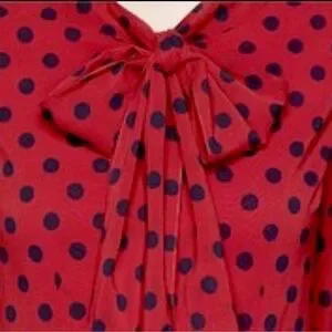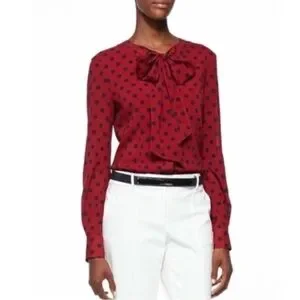 St. John silk neck tie blouse in a striking red and navy polka dot-an iconic, polished piece that embodies timeless American luxury.