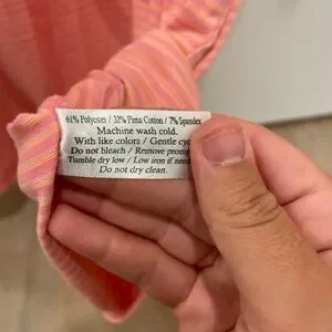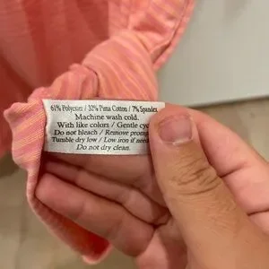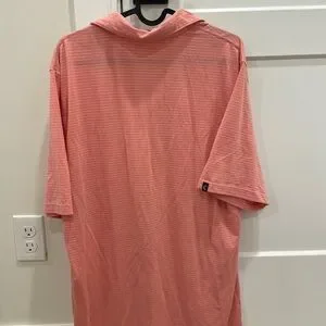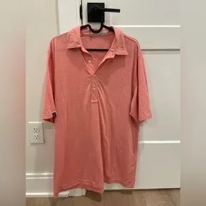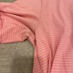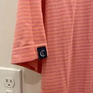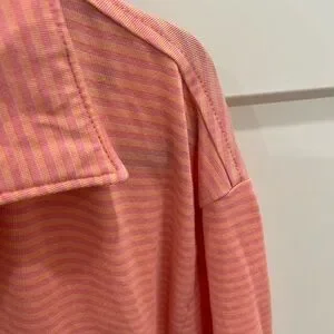 Stylish coral striped shirt. Short sleeves. Button-up collar. Perfect for casual wear. See pics of wear