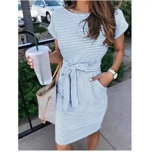 Merokeety short sleeve t-shirt dress features a classic blue and white horizontal stripe pattern. Designed with a comfortable crew neck and a flattering tie waist, this casual piece includes functional side pockets and a subtle dolman-style sleeve. The soft rayon blend fabric offers a slight stretch, making it an ideal choice for everyday wear or a relaxed weekend outing.