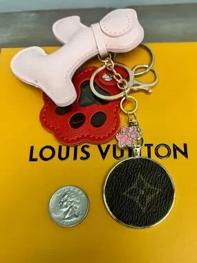 Paw key ring is silver tone with snap and plastic cover. Authentic monogram LV fabric from pochette inside. All pieces are brand new except for the LV enamel rhinestone pink paw.