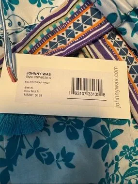 Wrap-style pant with teal floral print on an ivory base. Multicolor patterned trim and tassel detail. Vibrant border stripes in purple, orange, navy, and yellow. Easy, breezy silhouette with decorative tie.