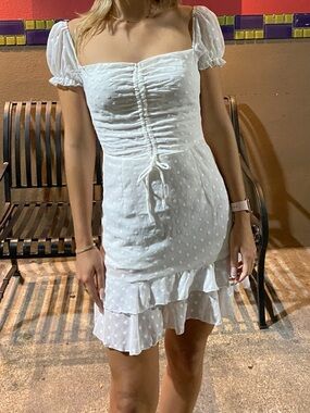 Sweet white mini dress with puff sleeves and ruched bodice. Swiss dot texture and ruffled hem add playful detail. Cinched tie at the waist creates a feminine silhouette. Lightweight and flirty for daytime or nights out.