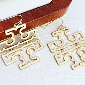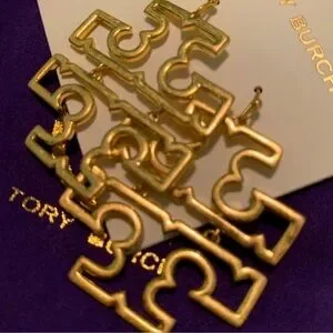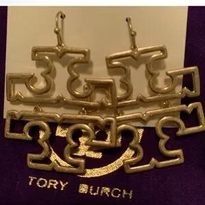 Signature Tory Burch double-"T" logo front large size drop earrings in Gold plated hardware.