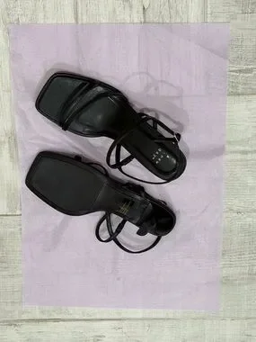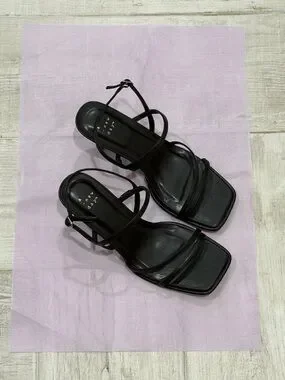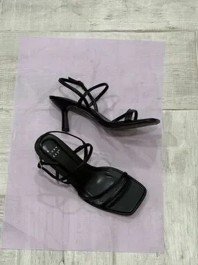 Chic black strappy heels with a square toe. Mid-height heel for easy wear. Adjustable ankle strap for a secure fit. Minimal, modern silhouette for versatile styling.
