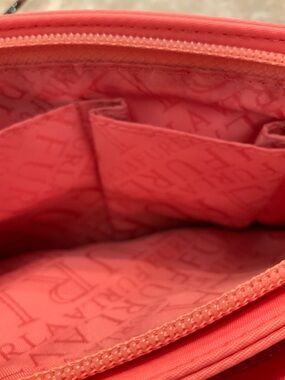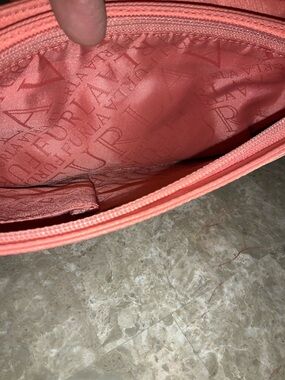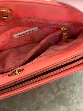 Compact Furla shoulder bag in coral with light pink trim. Single zip-top opening. Adjustable shoulder strap with gold-tone hardware. Sleek rectangular silhouette for everyday use.
