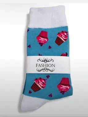 Playful cupcake print socks. Aqua background with pink and brown cupcake accents. White cuff and toe. Branded 'FASHION' label on packaging.