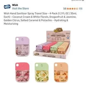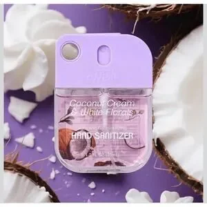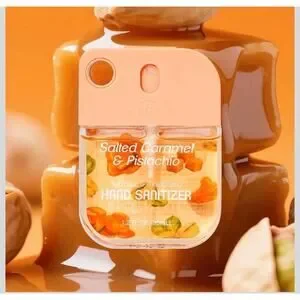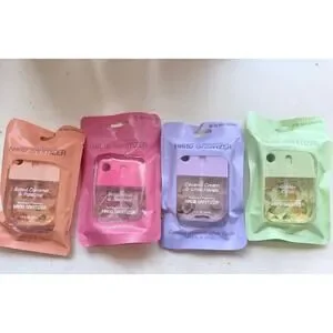 Travel hand sanitizer four different flavor. You get golden citrus, salted, caramel, and pistachio, coconut cream, and white floral and dragon, fruit and jasmine