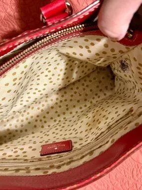 Bright red leather tote from kate spade. Gold-tone logo plaque and studs. Double top handles for easy carry. Clean, classic silhouette for daily use.