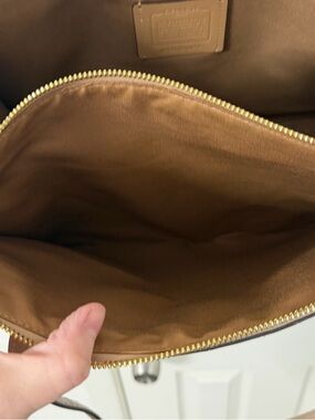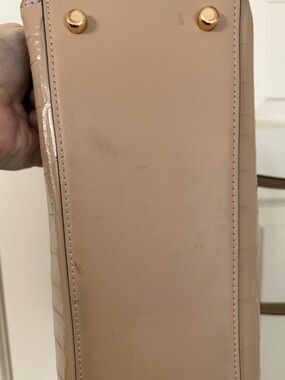 Coach Nina Carry All Tote In Taupe. Croc-embossed leather tote with structured silhouette. Top handles for shoulder or hand carry. Zip-top closure and leather hang tag. Polished gold-tone logo and hardware.