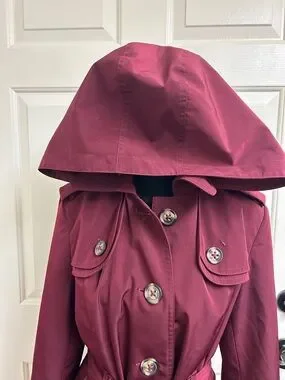 London fog medium maroon trench coat with button details. Features a tie waist for a tailored fit. Detachable hood with hidden buttons under collar. Shell 100%Polyester, Lining 100% Polyester Pit to Pit 21”, Length 34”, Excellent condition