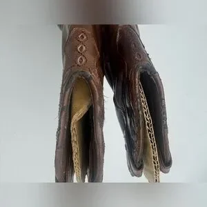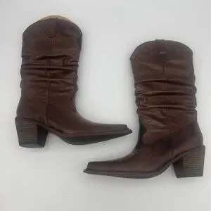 Stylish brown leather cowboy boots with a slouchy design. Perfect for a western look.