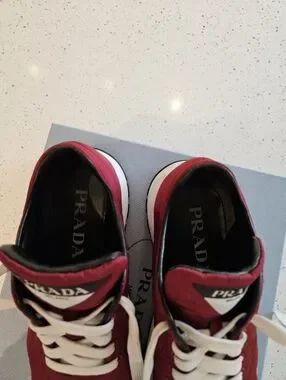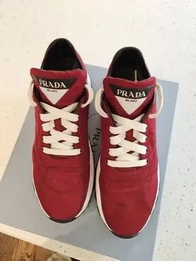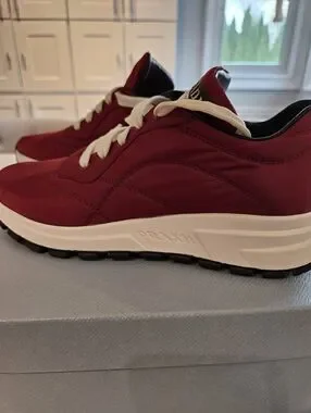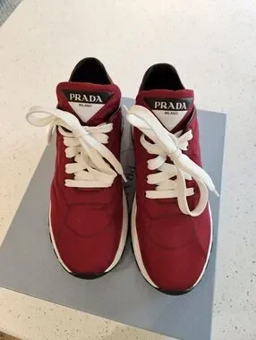 Red Prada sneakers with contrasting white laces and sole. Sleek sporty silhouette and branded tongue logo. Stylish everyday luxury. Size 37.5 / Fits more like a 7 and a narrower foot. Great Condition! Comes with the box and dust bags.