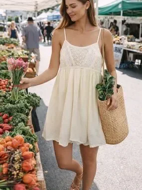 This cream lace sundress features a delicate crochet-style bodice with a flowy, lightweight skirt—giving you that dreamy cottagecore / boho vibe.