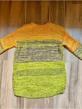 Colorful ombre knit with warm yellow/green and orange tones. Crew neckline and long sleeves. Soft and warm textured knit. Casual silhouette good for layering.