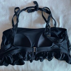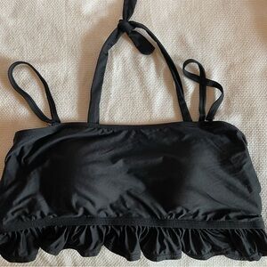 High cut bottom. Top has elastic around top, removable straps and cute ruffle detail. Built in bra