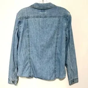 Express Bleus distressed light wash denim shirt jacket features button down front, long sleeves, signature buttons, lightweight 100% cotton fabric and can be worn as a shirt or lightweight jacket. Shacket.