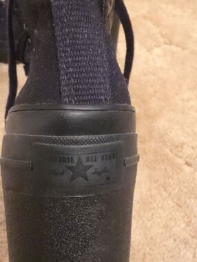 Platform high-top lace-up boots by Converse. Thick platform sole for added height. Canvas upper with rubber toe cap. Classic round logo patch on the ankle. Versatile edgy style for casual looks.