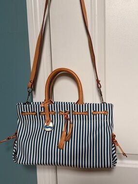 Navy and white striped tote with tan leather handles and accents. Stylish and versatile for everyday use. Features secure top closure and removable shoulder strap. Perfect for spring and summer!