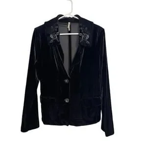 White Stag Black Velvet Embroidered Floral Collar Front Button Blazer