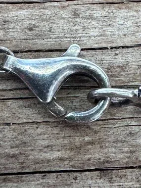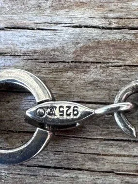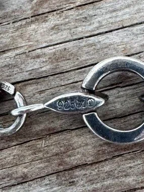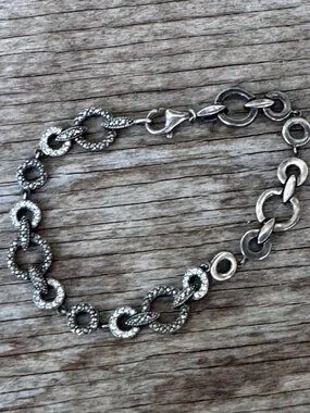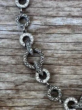 Sterling silver link bracelet with an oxidized finish and marcasite-style textured open circle links. Measures approximately 7 inches long and weighs 12.59 grams. Marked 925 on the clasp area. Elegant linked design with a nice vintage-inspired look. Preowned condition with light surface wear consistent with age and normal use. Please review photos for condition details.