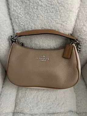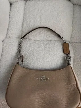 Coach shoulder bag in pebbled leather. Silver-tone hardware and logo plaque. Single top handle with chain-link detail. Zippered top for secure closure. Subtle, versatile shape for daily wear. This bag is in very good condition. It has been in my closet for a while since I haven’t been using it.