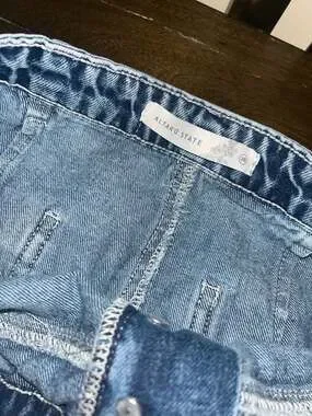 Altar'd State high rise wide leg jeans in a light to medium acid wash, women's size 28. These stylish denim pants feature prominent front and back patch pockets for a modern utility look.