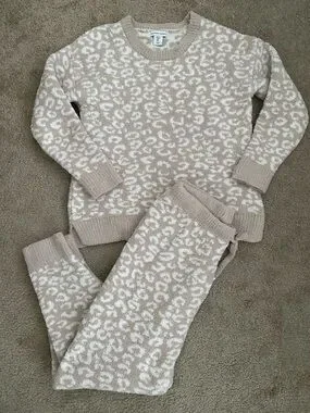 Soft fuzzy two-piece pajama set with neutral leopard pattern. Long-sleeve pullover top and matching elastic-waist pants. Cozy, plush knit for bedtime and lounging.