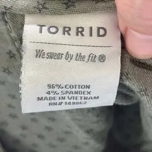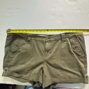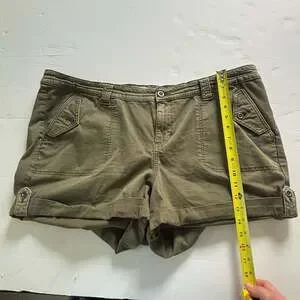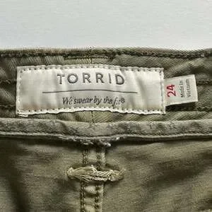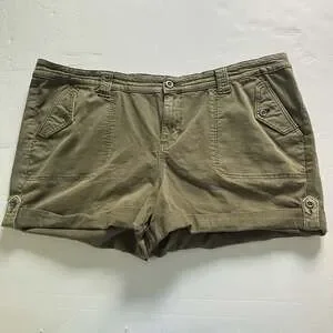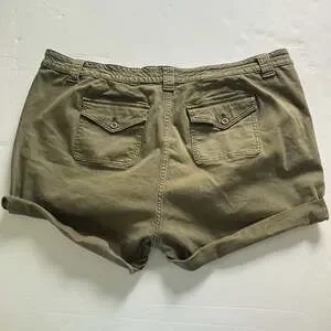 Torrid Olive Green Military Cargo Cuffed Shorts in women's plus size 24. These tactical-inspired shorts feature a classic olive green hue, button-flap front and back pockets, and stylish cuffed hems with button tab details. Made from a comfortable blend of 96% cotton and 4% spandex for a hint of stretch. Perfect for casual summer outings or outdoor activities. Excellent pre-owned condition with no visible flaws, holes, or stains. Approx measurements: 23-inch waist across, 16-inch total length.