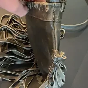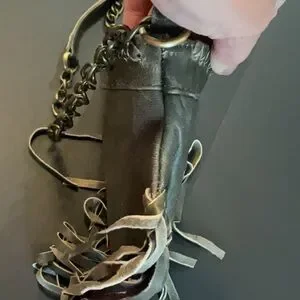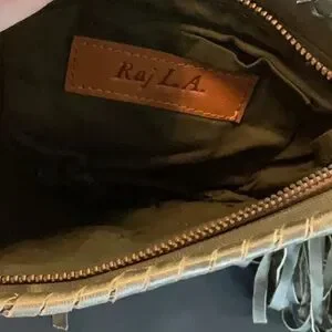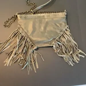Raj LA gray leather crossbody with leather fringe. Leather & chain strap. Zippered top, small pocket inside. Clean inside. Some small signs of wear (see photo's) but in good condition.