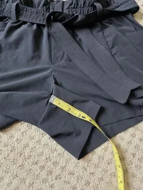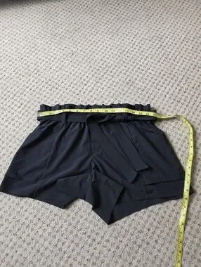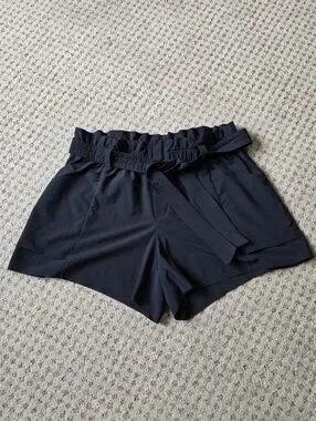 High-rise paperbag waist with a self-tie belt. Lightweight, flowy fabric for easy movement. Clean front seams and side pockets. Sleek black color for versatile styling.