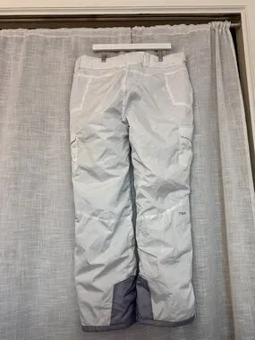 White insulated snow jogger pants with a relaxed fit for cold-weather activities. Lightweight, water-resistant fabric keeps you dry. Secure zip and snap waist with multiple utility pockets for essentials. Reinforced inner cuffs provide extra durability. Comfortable, versatile design for winter outings.