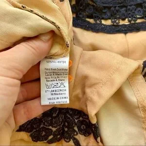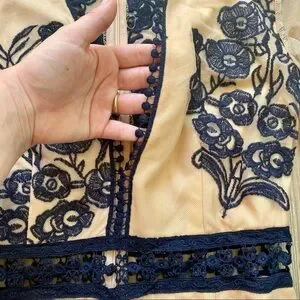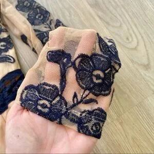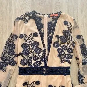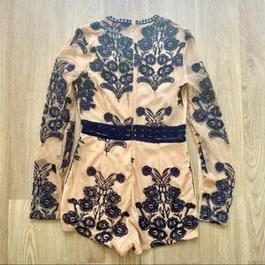 This stunning romper features a mesh material over a nude lining with navy blue floral embroidery and a deep v-neck with some ribbon detail. The romper is the perfect base for a special occasion/ night out/ date night look and would look great with some wedges or sandals and a navy blue blazer. Part of the back and the sleeves are completely sheer and give the illusion of the embroidery being directly on the skin! This is a great statement piece and in very good pre owned condition. It's a size Medium (see inside tag on last picture for size).