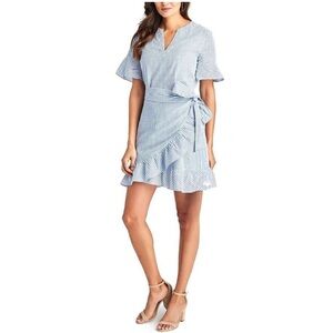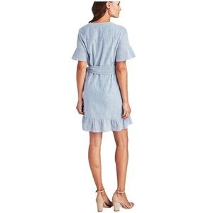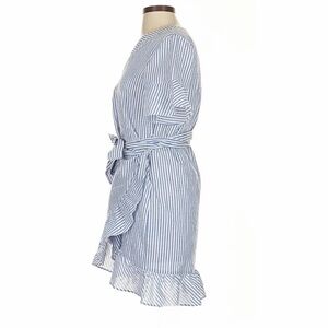 Excellent condition no flaws. Details: seersucker, v neck, short flutter sleeves, lined, faux wrap, striped, mini length. Material: cotton blend. Laying flat: pit 19 inches; length 35 inches; shoulder 15.5 inches.