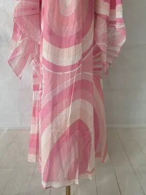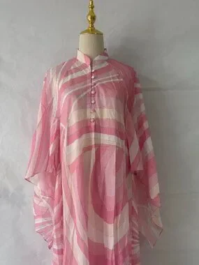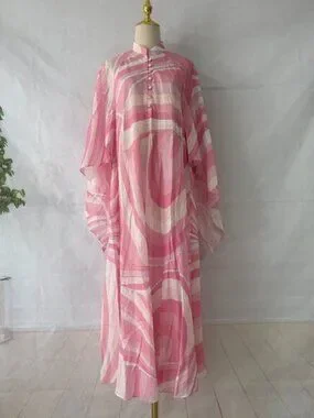 This exquisite maxi dress features a cleverly designed, fluid, and ethereal silhouette. Its captivating abstract swirl print—reminiscent of flowing brushstrokes—combines a relaxed, draped cut with a cinched waist, offering the comfort of a robe without sacrificing the elegance of formal evening wear. It is an exceptional choice for any occasion, whether for a leisurely vacation or an evening event.