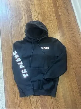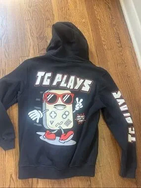 Black pullover hoodie featuring bold 'TG PLAYS' graphics on the sleeve and chest. Soft, comfortable fabric with a front kangaroo pocket and adjustable drawstring hood. Simple, street-ready style that pairs well with casual outfits. Color noted: black.